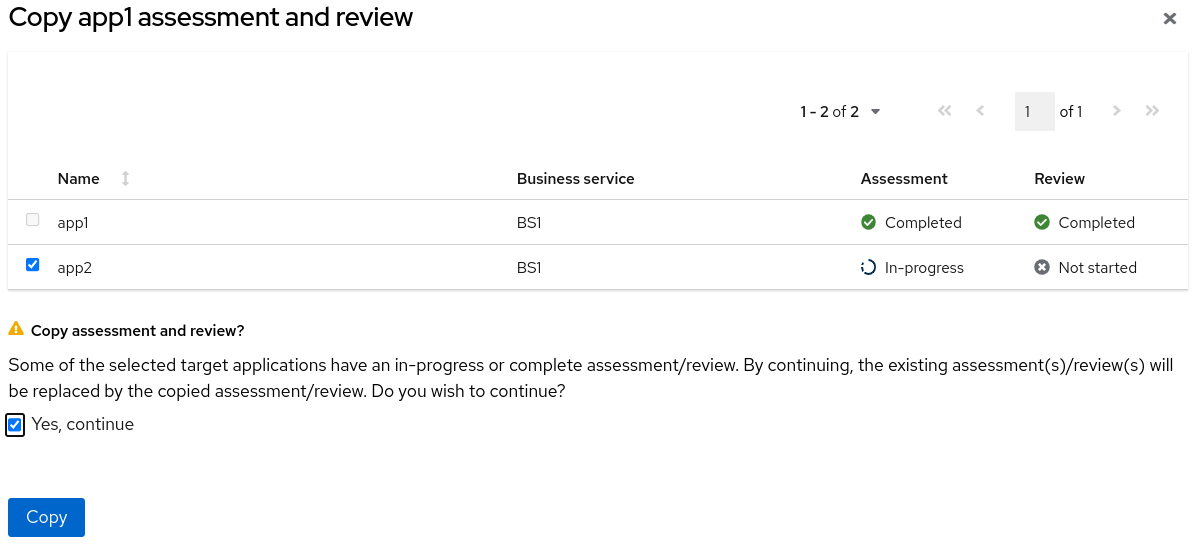 - Click the checkbox of the application(s) to copy the assessment or assessment and review to.